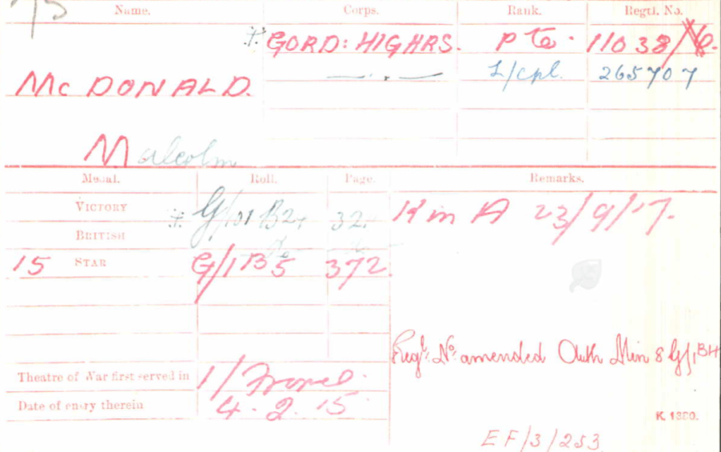 Malcolm McDonald was awarded the 1914-15 Star, Victory and the British War Medals for his service in the Great War.