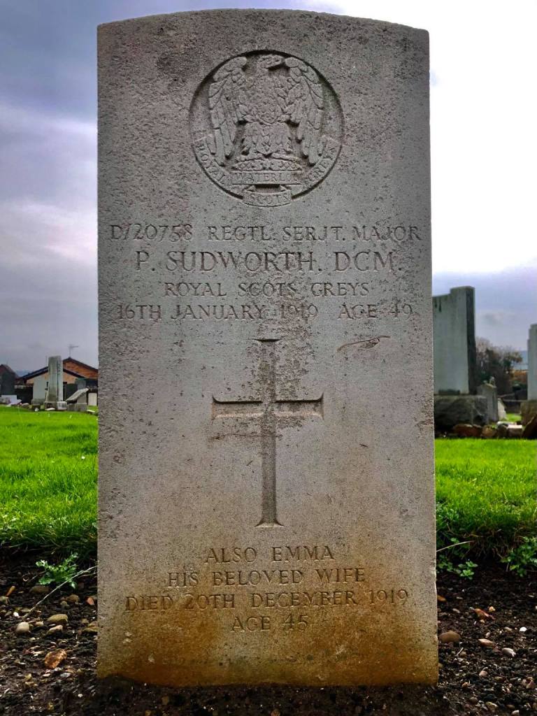 Tragically his wife Emma died ten months after Percival on 20 December 1919 and is buried in the same grave at Dunbar Cemetery. His son Percival Clifford Sudworth also died shortly after his father on 17 March 1921 at the British Hospital Belbeis, Egypt and also while serving with The Royal Scots Greys and is buried at Cairo New British Protestant Cemetery, Cairo, Egypt.