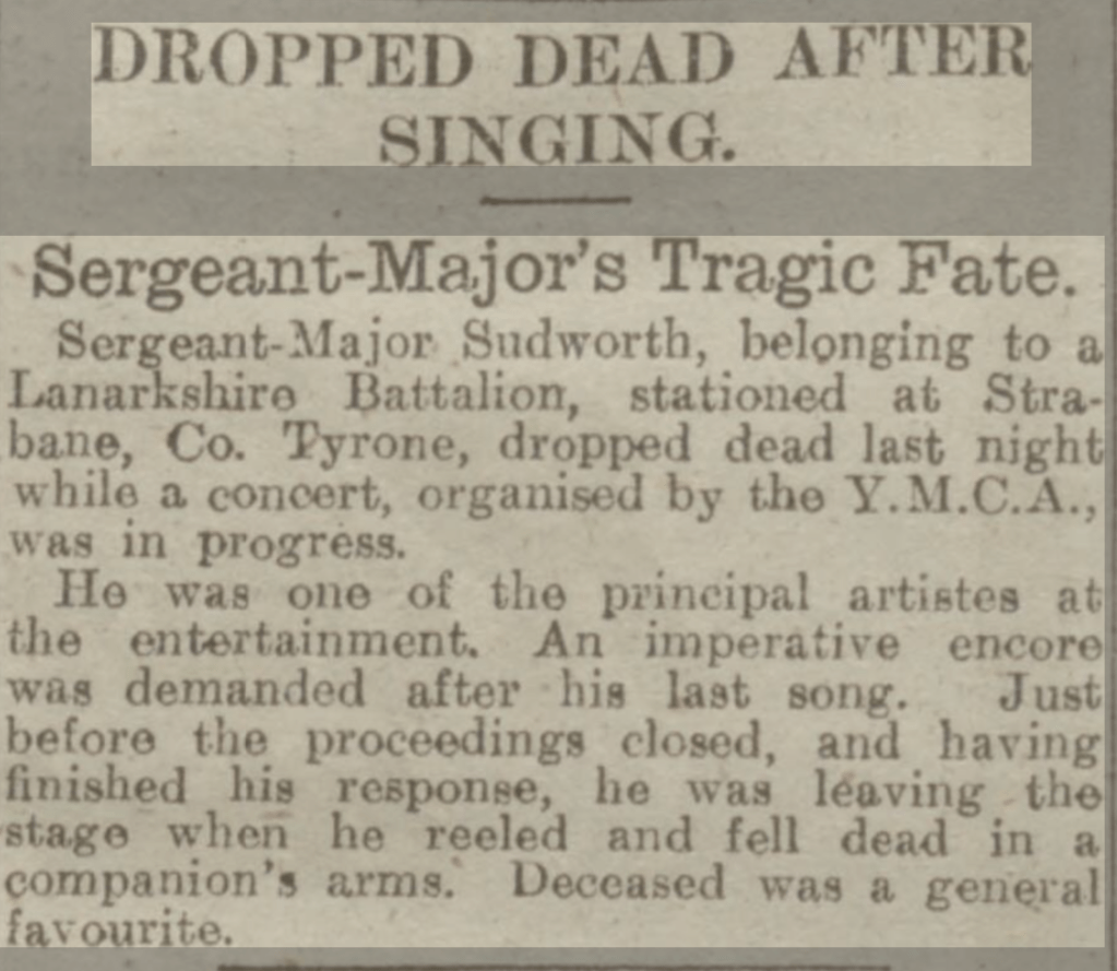 - 21 September 1918 – Appeared in Londonderry Sentinel as organising member of sports tournament in Strabane, Co. Tyrone while with Lanarkshire Yeomanry.