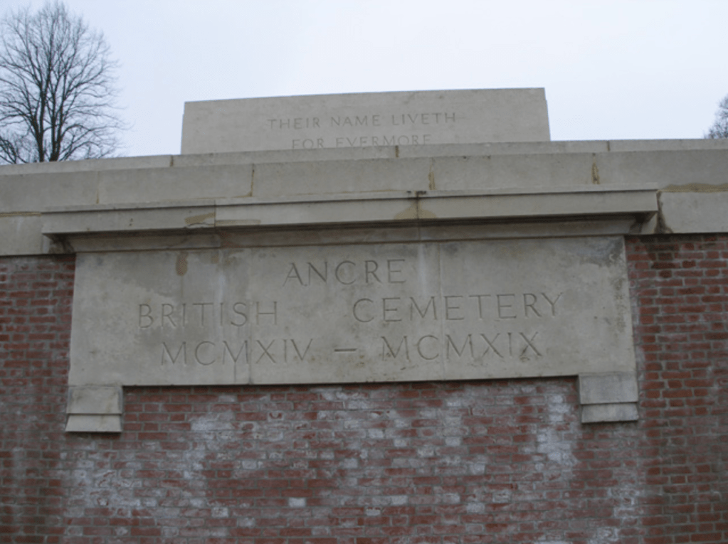 The village of Beaumont-Hamel was attacked on 1 July 1916 by the 29th Division, with the 4th on its left and the 36th (Ulster) on its right, but without success. On 3 September a further attack was delivered between Hamel and Beaumont-Hamel and on 13 and 14 November, the 51st (Highland), 63rd (Royal Naval), 39th and 19th (Western) Divisions finally succeeded in capturing Beaumont-Hamel, Beaucourt-sur-Ancre and St. Pierre-Divion. Following the German withdrawal to the Hindenburg Line in the spring of 1917, V Corps cleared this battlefield and created a number of cemeteries, of which Ancre British Cemetery (then called Ancre River No.1 British Cemetery, V Corps Cemetery No.26) was one. There were originally 517 burials almost all of the 63rd (Naval) and 36th Divisions, but after the Armistice the cemetery was greatly enlarged when many more graves from the same battlefields and from the smaller burial grounds were added. There are now 2,540 Commonwealth casualties of the First World War buried or commemorated in the cemetery. 1,335 of the graves are unidentified, but special memorials commemorate 43 casualties known or believed to be buried among them. There are also special memorials to 16 casualties know to have been buried in other cemeteries, whose graves were destroyed by shell fire. The cemetery was designed by Sir Reginald Blomfield. The ROYAL NAVAL DIVISION MEMORIAL for the capture of Beaumont-Hamel is a stone obelisk erected beside the main road from Arras to Albert, at Beaucourt-sur-Ancre.