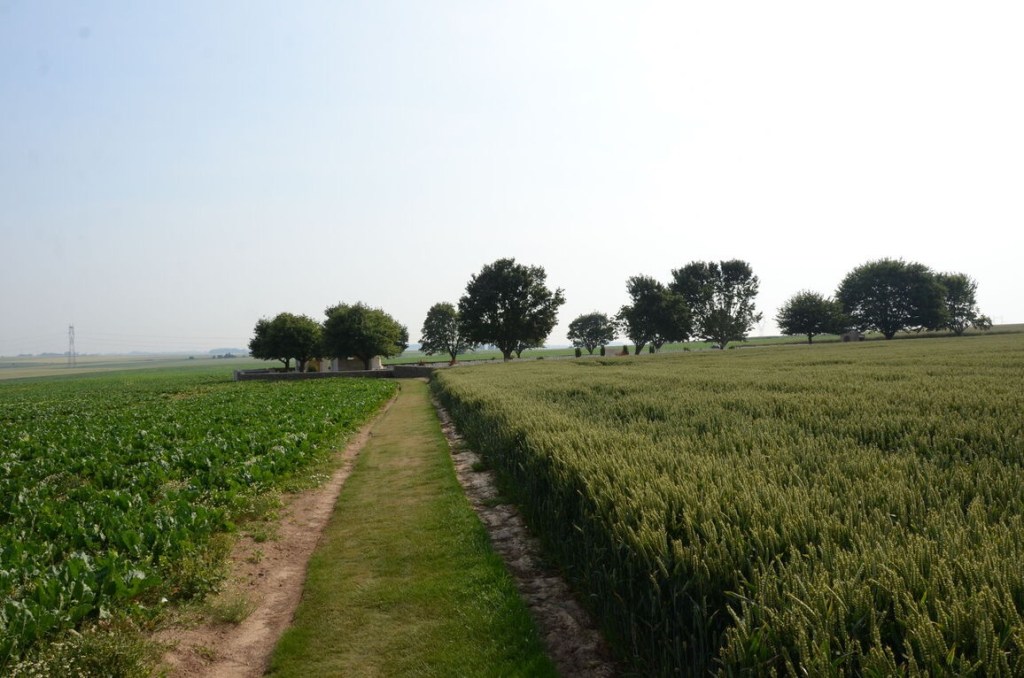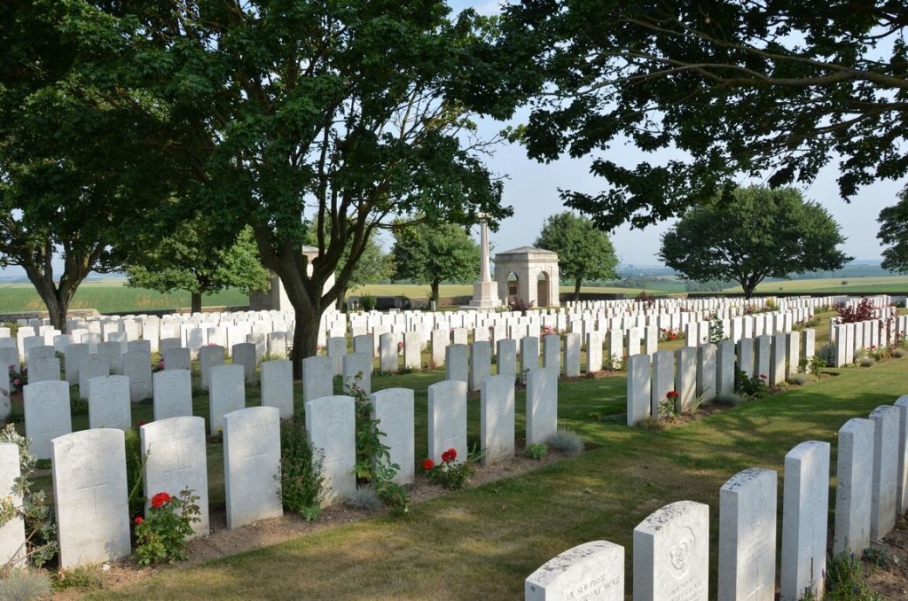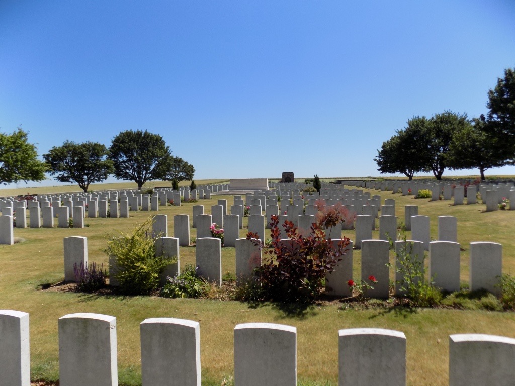 On 1 July 1916, the first day of the Battle of the Somme, Grandcourt village was reached by part of the 36th (Ulster) Division, but it was not until the German withdrawal to the Hindenburg Line, early in February 1917, that it was occupied by patrols of the Howe Battalion, Royal Naval Division. To the south-east of it is Courcelette, taken by the 2nd Canadian Division on 15 September 1916. Regina Trench was a German earthwork, captured for a time by the 5th Canadian Brigade on 1 October 1916, attacked again by the 1st and 3rd Canadian Divisions on 8 October, taken in part by the 18th and 4th Canadian Divisions on 21 October, and finally cleared by the 4th Canadian Division on 11 November 1916. The original part of the cemetery (now Plot II, Rows A to D) was made in the winter of 1916-1917. The cemetery was completed after the Armistice when graves were brought in from the battlefields of Courcelette, Grandcourt and Miraumont; most date from October 1916 to February 1917. Two considerable groups of scattered graves, classed as cemeteries, were concentrated in to Regina Trench Cemetery:- COURCELETTE ROAD CEMETERY, MIRAUMONT, was on the West side of West Miraumont Road, between Courcelette and Miraumont, and in it were buried soldiers from Canada and from the United Kingdom, who fell in September-November 1916. MIRAUMONT BRITISH CEMETERY, on the East side of the same road, contained the graves of soldiers from Canada and from the United Kingdom, who fell in September-December 1916. Regina Trench Cemetery now contains 2,279 burials and commemorations of the First World War. 1,077 of the burials are unidentified, but there are special memorials to 14 casualties believed to be buried among them. One American airman is also buried in the cemetery. (Text and Images © CWGC)