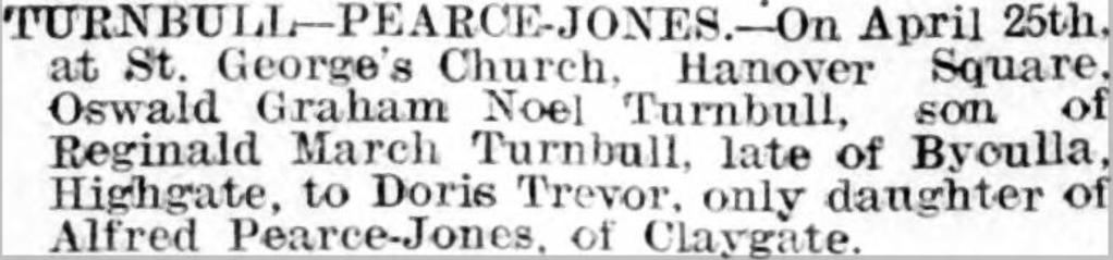 - 25th April 1914 – He married Doris Trevor Pearce-Jones at St George’s Church, Hanover Square, London.