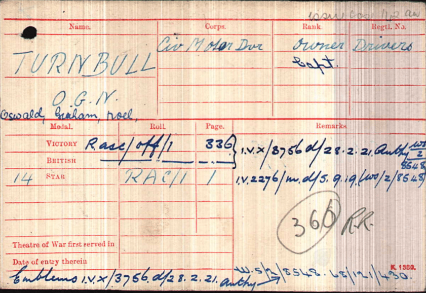Oswald Graham Noel Turnbull was awarded The Military Cross, the 1914 Star, the Victory and the British War Medals for his service in the Great War.