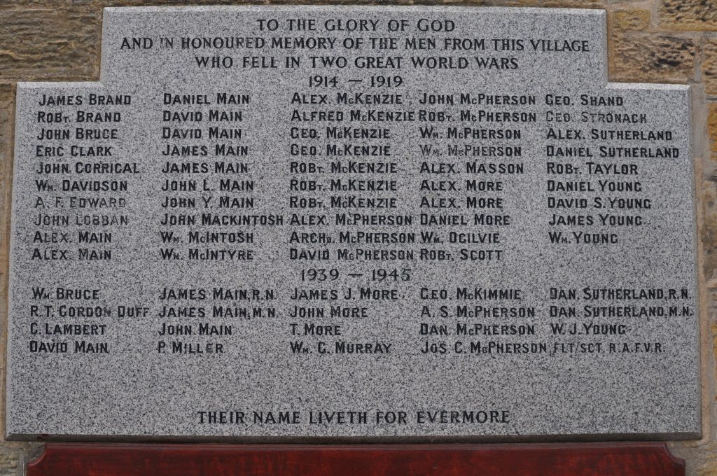 Young, David S. – No.1182, Corporal, 1/6th Seaforth Highlanders; born at Hopeman, 2nd November 1892; joined at Hopeman, November, 1911; served in France; killed at Festubert, 15th June 1915. Son of George and Helen S. Young, 53, Harbour Street. Occupation – Engineer.