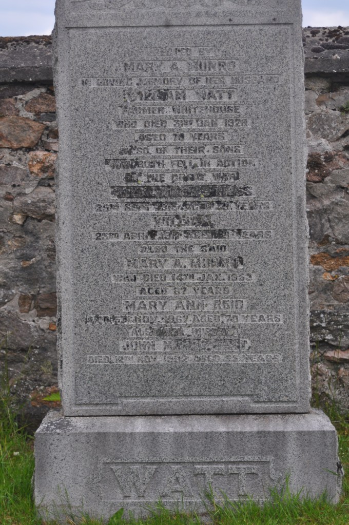 William Watt was born circa 1896 at Aberlour, Banffshire, he was the second son of William Watt, Farmer, Whitehouse, near Aberlour and his wife Mary Ann Munro or Watt. The family probably moved into Whitehouse around 1900 when his grandfather, Alexander Watt who had the tenancy of Gownie, Aberlour took over the tenancy at Whitehouse. He had at least three other brothers according to the 1901 Census.