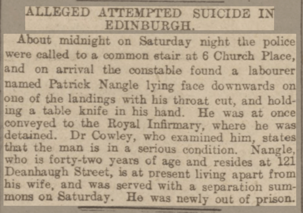 Patrick Nangle was born on 2 July 1890 at Wishaw, Lanarkshire. The following family information is taken from the 1891 and 1901 Census and family research.