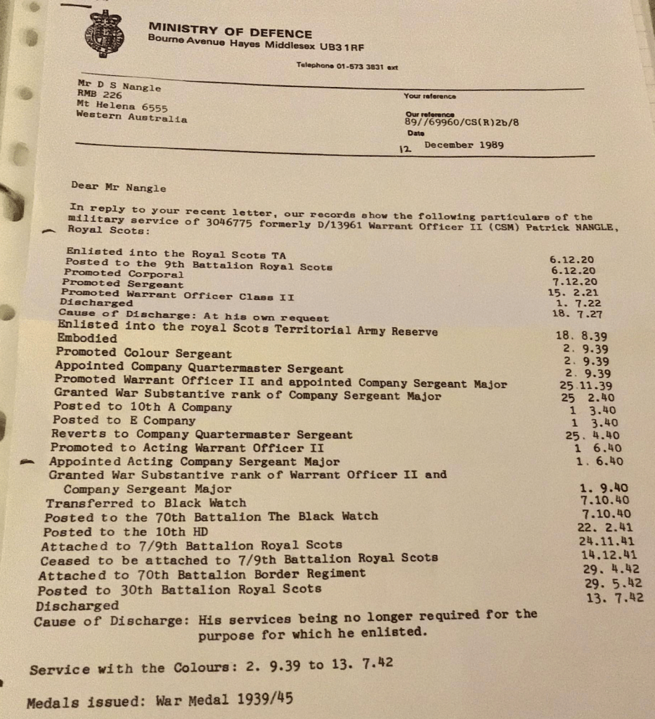 The following information was sent to the family from the Ministry of Defence dated 12 December 1989 following a request from his family. It shows that he re-enlisted into The Royal Scots in December 1920 and discharged again in July 1927, he then re-enlisted again in August 1939 at the outbreak of WWII and discharged in July 1942, his service being no longer required. During that time he had the service numbers of 3046775 and D/13961 and achieved the rank of Warrant Officer 2nd class (Company Sergeant Major).