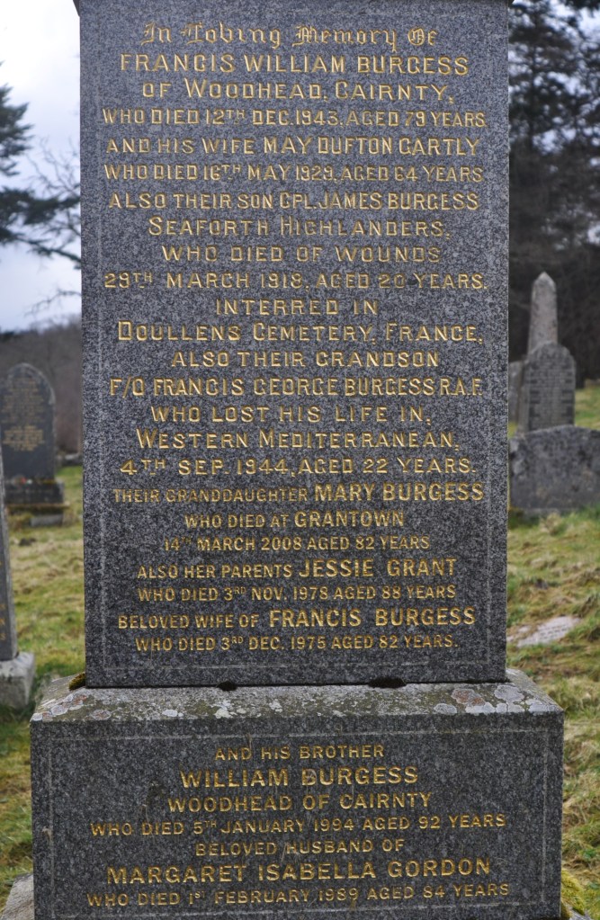 James Burgess enlisted at Elgin, Morayshire. He served within the Seaforth Highlanders, initially in the 4th Battalion as number 2634 where he achieved the rank of Corporal. He then moved to the 7th Battalion as number 202728 where records show that at some time he was an Acting Serjeant. He served in the France / Belgium Theatres of War.