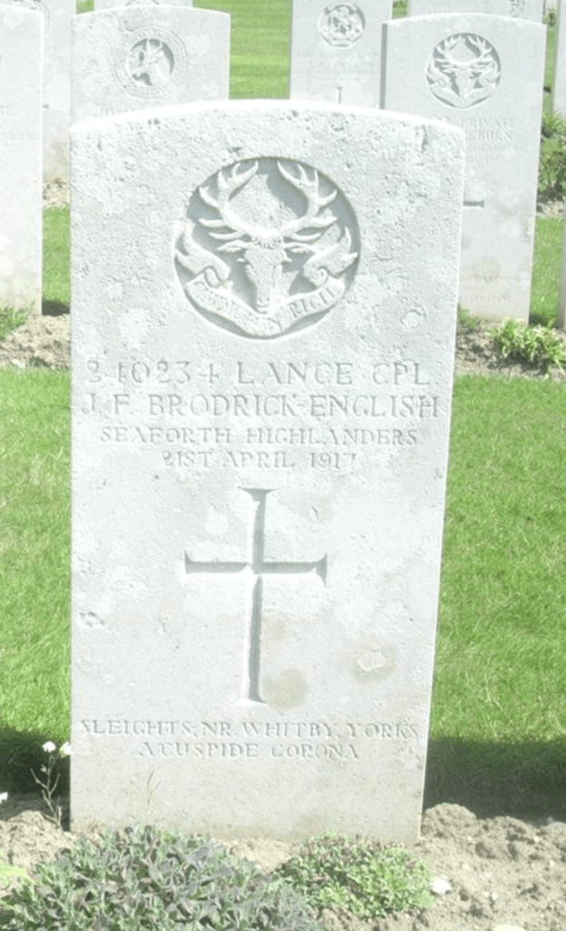 Brodrick-English, James Falconer, Lance-Corporal, 1/5th (Territorial) Battalion, The Seaforth Highlanders (Ross-shire Buffs, The Duke of Albany’s), only son of the late Arthur English, Solicitor, by his wife, Mary (Kamsahd, Sleights, county York), elder daughter of the late Reverend John Barry Brodrick, M.A., for 51 years Rector of Sneaton, near Whitby; born Sleights, York, 26 February 1892; educated Bramcote, Scarborough, and Epsom College; was employed on the staff of the National and Provincial Bank at Middlesbrough; joined the Seaforth Highlanders 14 September 1914; served with the Expeditionary Force in France from April, 1915; was offered a commission, but refused to take it, and died at Camiers 21 April, 1917, from wounds received in action at the Battle of Arras on the 9th. Buried in the Military Cemetery at Etaples.