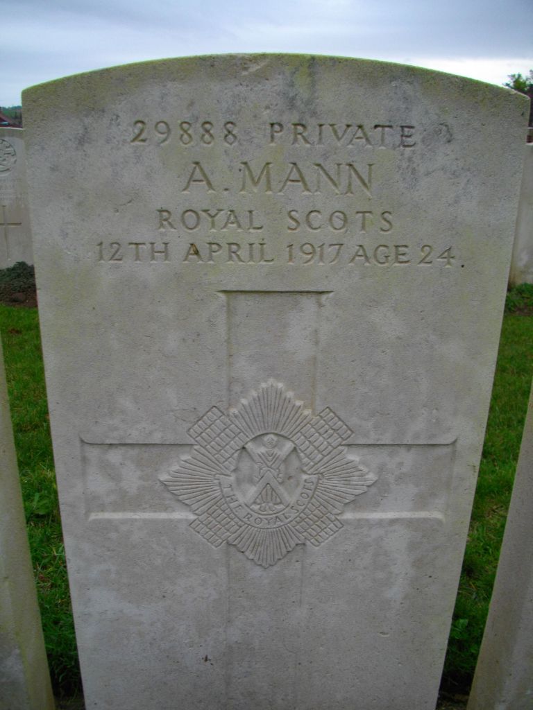 Mrs Mann, Duff Street Has received notice from the War Office, that her husband, Private Alexander Mann of the Royal Scots, was killed in action on the 12th of April (1917). He was a son of the late Mr Robert Mann, old town, and was married about a year ago. He had been in France for about a year. He had been in America for four years, and came back to this country on the outbreak of hostilities.