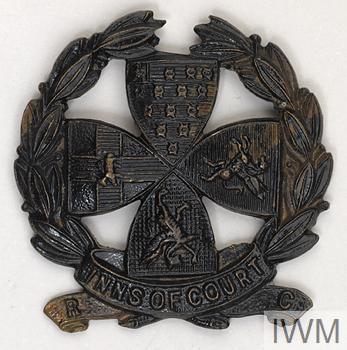 Inns of Court Reserve Corps – In bronze. Within a laurel-wreath four shields placed in the form a cross with the bottom points touching in the centre, each shield bearing one of the arms of the Inns. On the base of the wreath a scroll inscribed ‘INNS OF COURT R C’ Copyright: © IWM – (INS 7861)