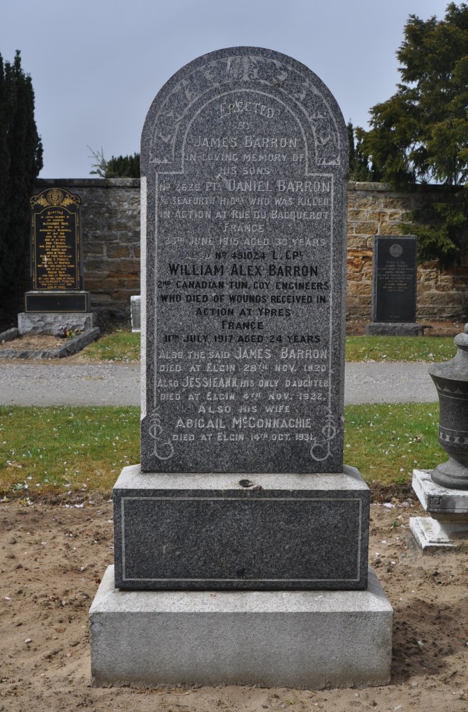 William Barron was born at Elgin, 15th June, 1893. Although the Canadian records have his year of birth as 1891, it is believed that 1893 is correct. The following family information is taken from the Morayshire Roll of Honour, Family Headstone and the 1891 and 1901 Census.
