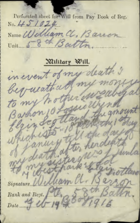 - 1 March 1917 – New Will signed at No.2 Tunnelling Company. Canadian Engineers.
