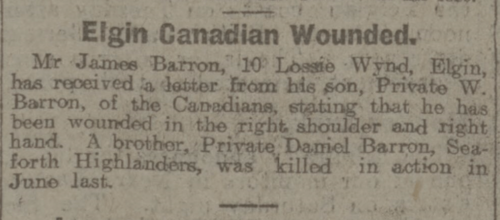 William Alexander Barron received a gunshot wound to his lower spine on or about 29 June 1917, this appears to have left him in a paralysed state. He was transferred through various medical facilities until he arrived at the Dover Military Hospital, England on the 7th July 1917. He died four days later on the 11th July 1917. He was later buried in a family grave at Elgin New Cemetery, Elgin Moray.