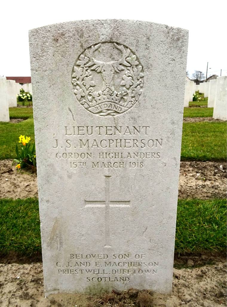 He is buried in the Calais Southern Cemetery. A simple inscription reads:- “BELOVED SON OF C. J. AND E. MACPHERSON PRIESTWELL, DUFFTOWN SCOTLAND”