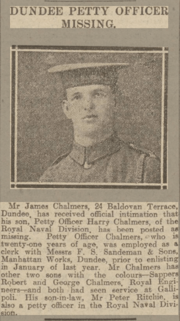Harry Chalmers was born on 18 September 1895 at Dundee, to James Chalmers a Harbour Porter and his wife Betsey. The Jute industry clearly played an important part in the life of the family as from the 1901 Census they were living at 61 Watson Street, Dundee and three of the children aged between 14 – 18 were working within the Jute Mills. From this Census, Harry was the 7th of 8 children.