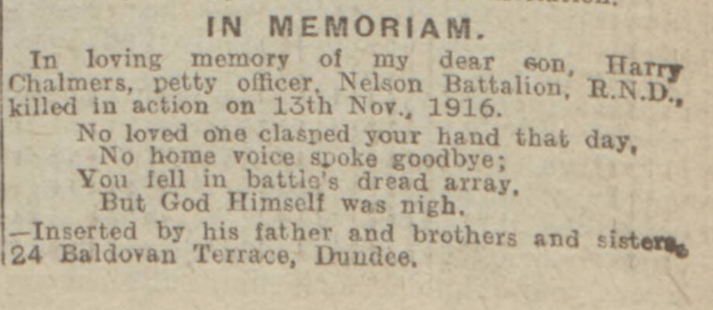 Harry Chalmers was born on 18 September 1895 at Dundee. The following family information is taken from the 1901 Census.