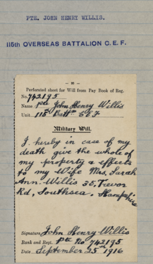 Private John Henry Willis of the 24th Canadian Infantry Battalion was killed as a result of a training accident on 14 October 1916.
