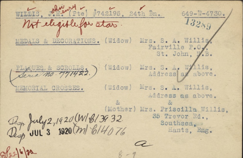 John Henry Willis was awarded the Victory and the British War Medals for his service in the Great War which were sent to his widow along with a Death Plaque and scroll.