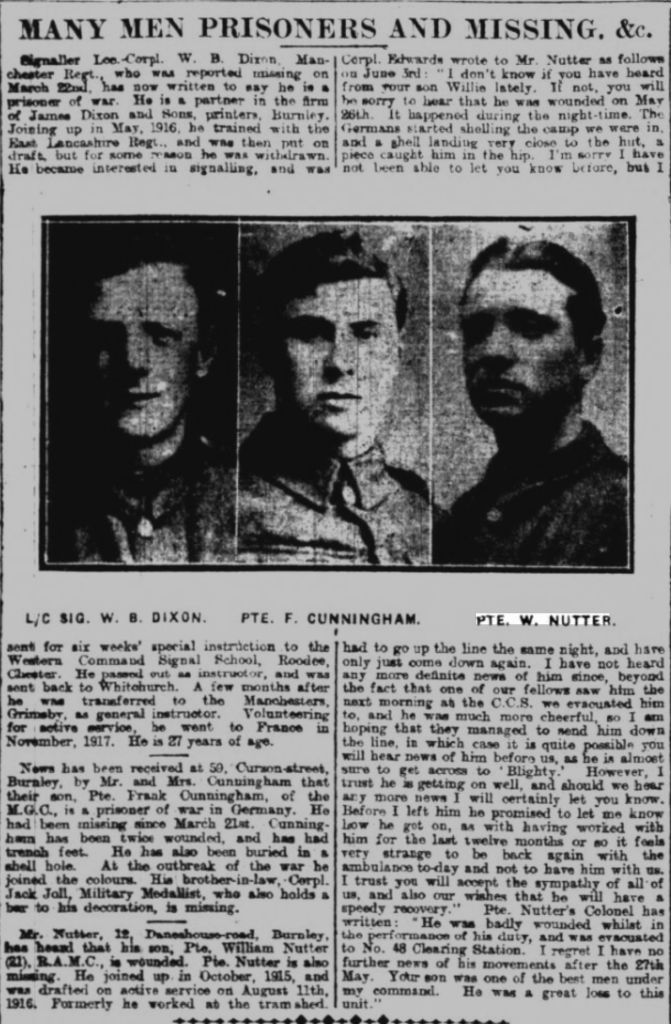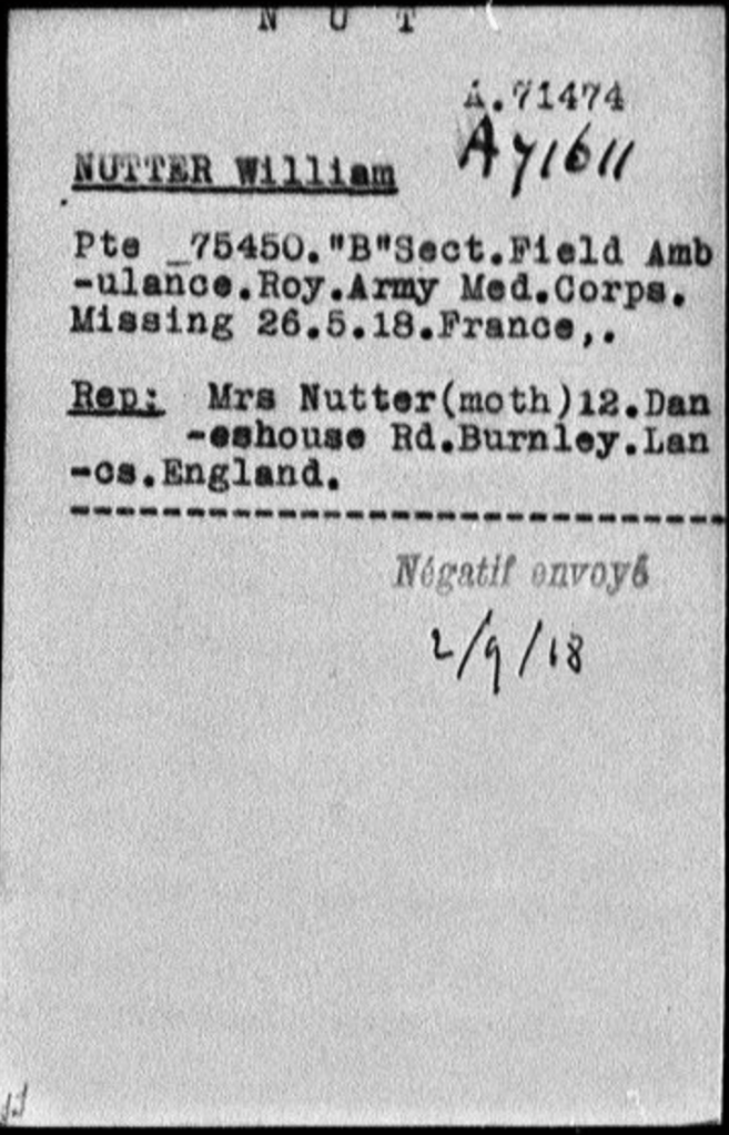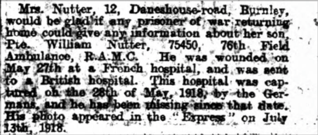 Extract from the above publication :- “Mrs. Nutter, 12, Daneshouse Road, Burnley, would be glad if any prisoner of war returning home could give any information about her son, Private William Nutter, 75450, 76th Field Ambulance, R.A.M.C.. He was wounded on the 27th at a French hospital, and was sent to a British hospital. This hospital was captured on the 28th of May, 1918, by the Germans, and he has been missing since that date. His photo appeared in the ‘Express’ on July 13th, 1918.”