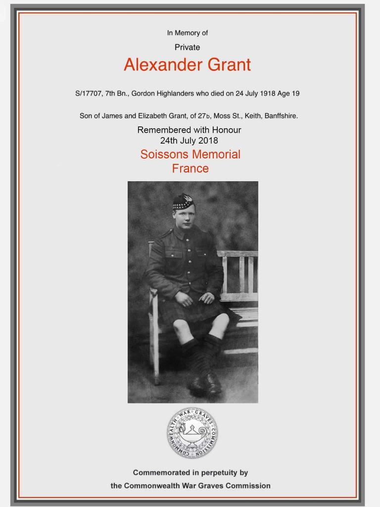 An extract from the above publication – Private, No. 17707, 7th (Territorial) Battalion, The Gordon Highlanders, youngest son of James Grant, of 20b, Mid Street, Keith, by his wife, Elizabeth Burgess, daughter of the late William Burgess, of Park Head, Botriphnie; born Keith, Banffshire, 13 August, 1898; educated Grammar School there; enlisted in the 3rd Gordon Highlanders 23 April 1917; served with the Expeditionary Force in France and Flanders from 29 March, 1918, being transferred to the 7th Battalion, and was killed in action near Rheims 20-24 July following. Buried at Marfaux, south-west of Rheims.
